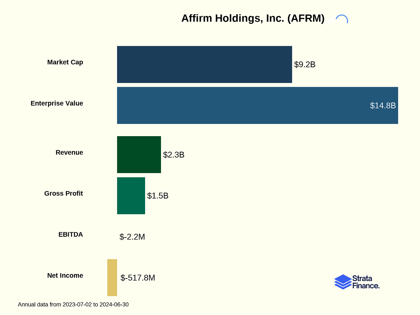 Let's address the elephant in the room: Affirm is still losing money. The company reported a net loss of $517.8M in FY2024. But before you run for the hills, that's actually a significant improvement from the $985.3M loss in FY2023 ↗️ 47% reduction in net loss.