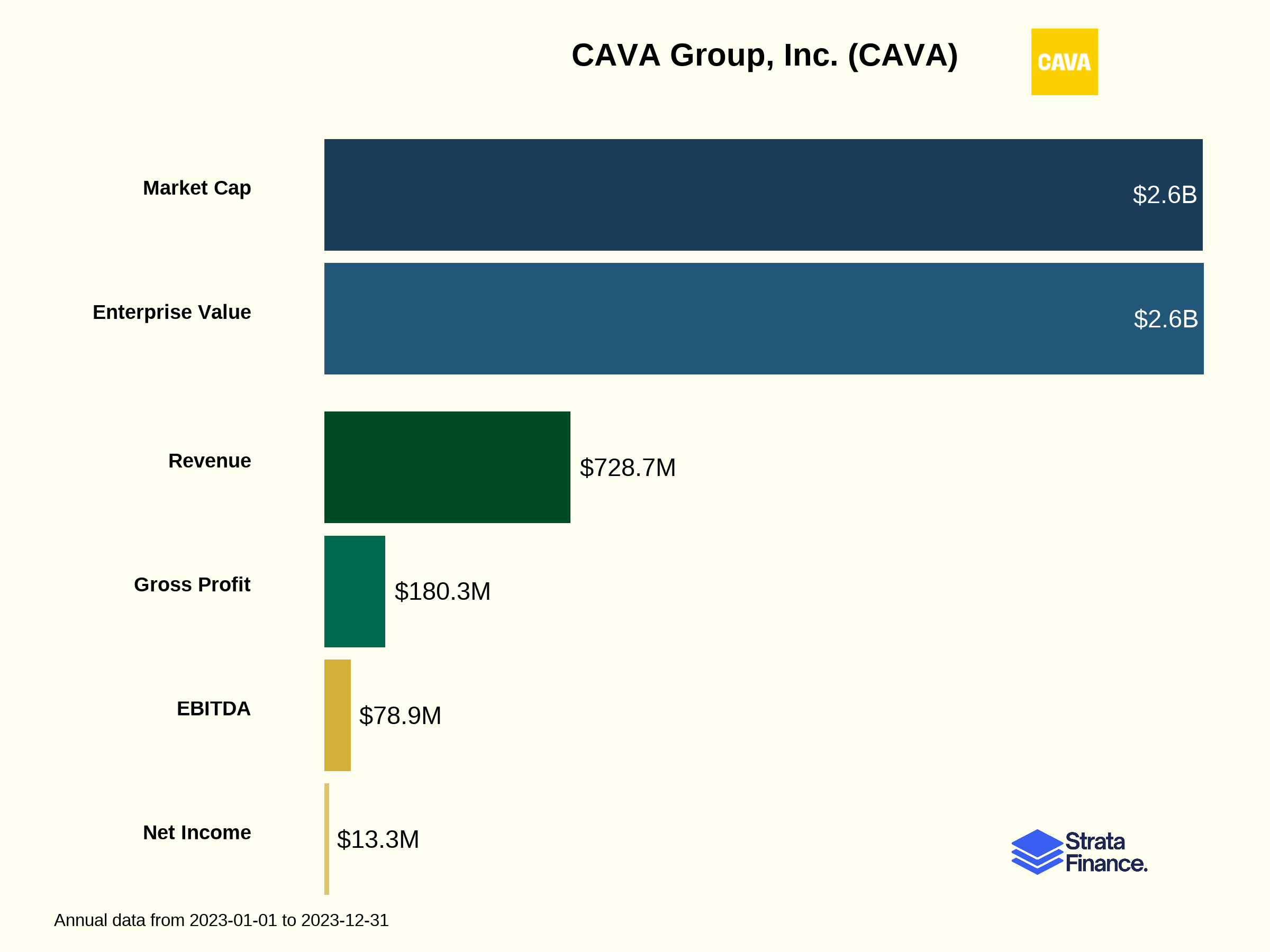 After years of red ink, CAVA is finally making money! The company reported net income of $13.3 million in fiscal 2023 ↗️, a dramatic improvement from the $59.0 million loss in fiscal 2022. That’s like going from being deeply underwater to finally coming up for air and finding yourself on a sunny beach.