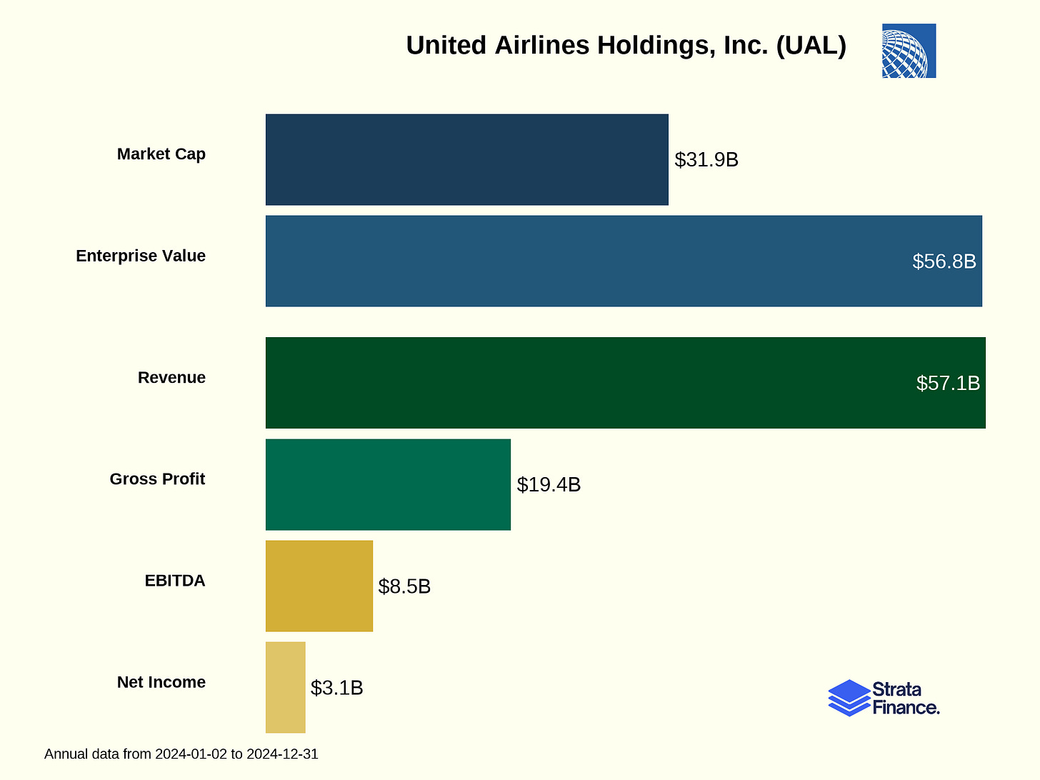 Cargo Revenue ($1.7 billion, 3% of total revenue ↗️): All that stuff in the belly of the plane that isn’t your lost luggage. United transports freight and mail across its global network.